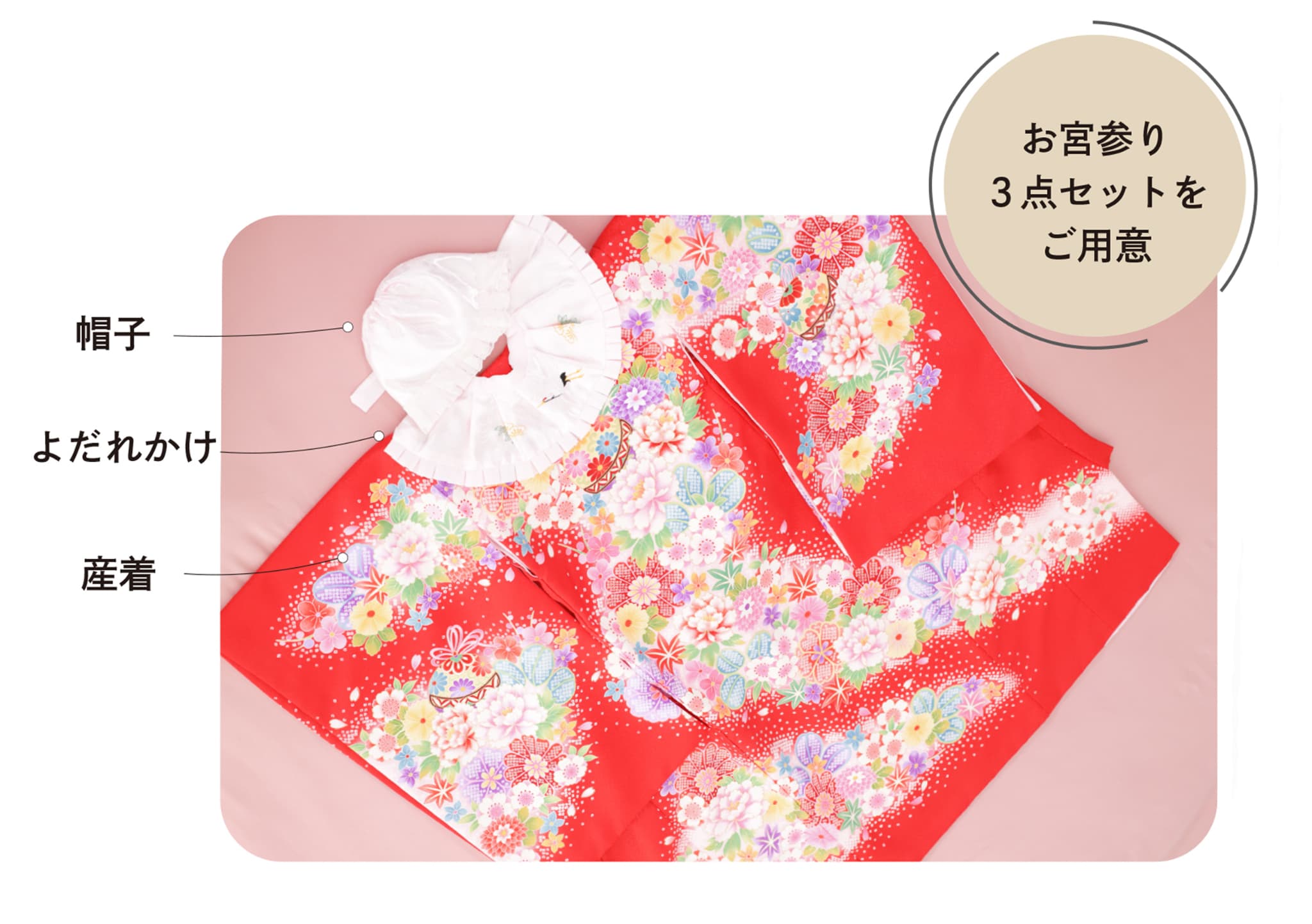 また、菅原天満宮や郡山八幡神社などへのお参り用として、お宮参り着物(産着)のレンタルも行っており、撮影からお参りまで幅広くサポートいたします。